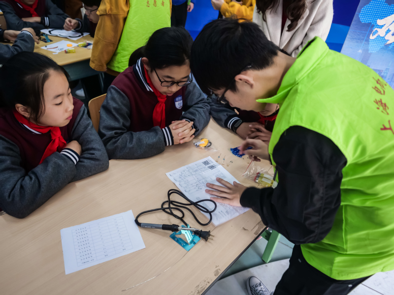 愉快学习的时间总是过得很快,不知不觉就到了最后一个环节:电焊无人小车和DIY制作小课堂。临外的学生们跃跃欲试,积极参与到动手操作中。在我校志愿者们的帮助下,大家合作把一个个零件组装、焊接成了一辆辆小车、会动的机器人、自动发球机等作品,看着临外学生们满足的笑容,志愿者们也很有成就感。