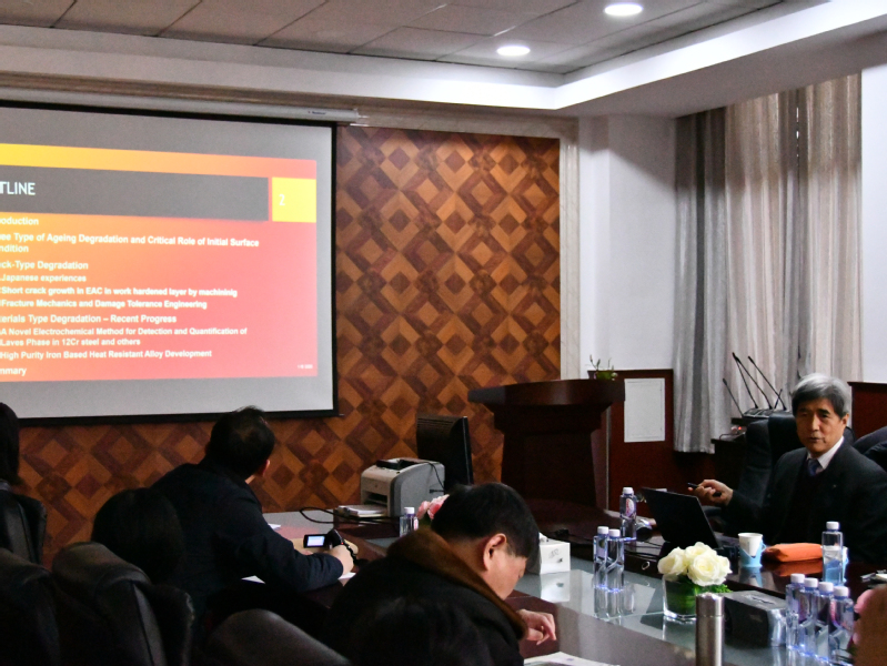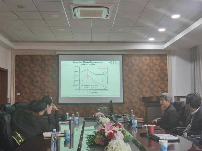 庄子哲雄教授重点介绍了为了提高材料的老化性能,他的团队近年来在高抗老化性能合金设计和制造方面取得的一些成果和进展。详细讲述了三种老化类型,即:材料类型退化、表面类型退化和裂纹类型退化。介绍了几种裂纹类型退化的实例,着重介绍了短裂纹扩展和氢效应在设备寿命评价中的应用。此外,还介绍了一些铬钢在热时效和蠕变过程中的新技术。讨论阶段,教师张永涛、周建华、居钰生等多位教师与庄子哲雄教授探讨了“Discussion-Effects of hydrogen and surface condition”等多个问题,与会教师纷纷表示受益匪浅,希望能够有机会再次交流学习。