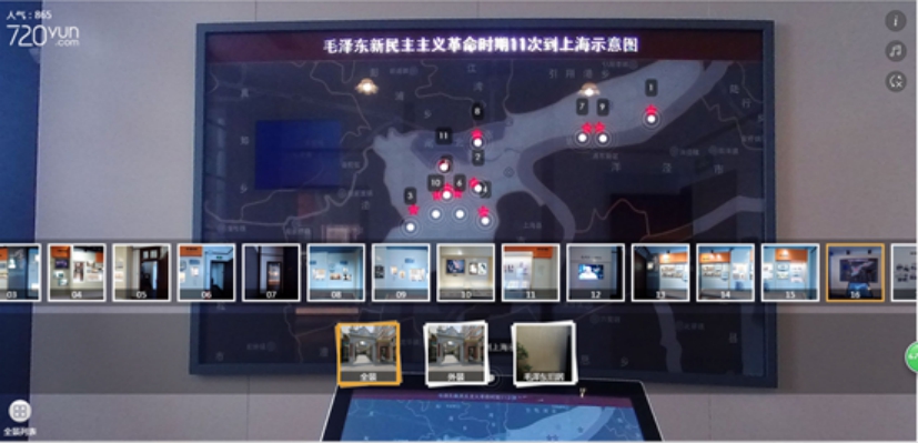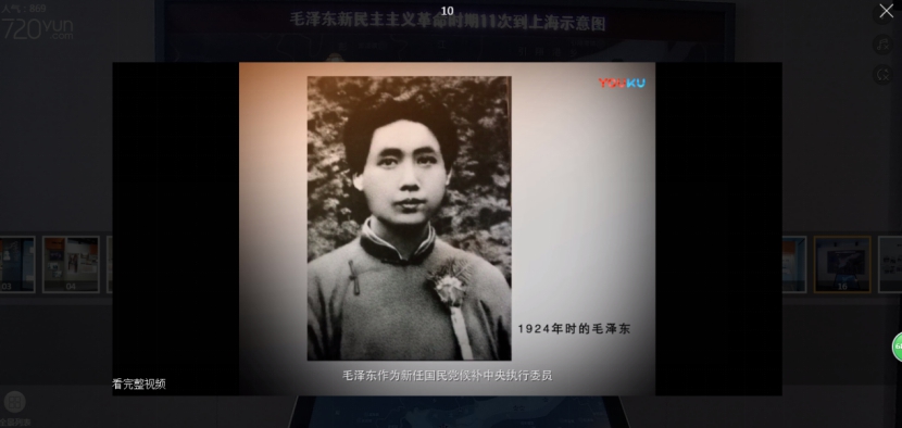 背景分析之后,刘俊展示了茂名北路120弄7号一座典型的上海石库门建筑,然后通过VR全景平台介绍了上海毛泽东旧居各个房间及陈列馆,通过VR全景参观了陈列馆,重点介绍了1924年毛泽东在上海为中国共产党中央局、中国国民党上海执行部工作的10个月期间,为巩固国共合作、推进国民革命而作出的杰出贡献。