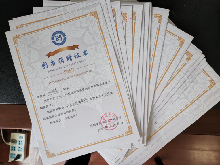 为感谢同学们对毕业季捐书活动的支持,学院给每位捐书的同学颁发了捐赠证书,相信这些书籍能给低年级学生起到很大的帮助。
