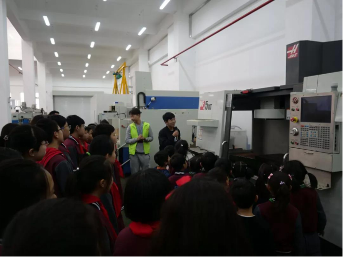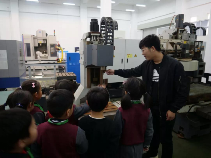 临外的师生首先参观了机械楼大厅,紧接着在我校志愿者带领下,观摩了传统先进制造业展区,小朋友们对传统工业制造技术很感兴趣,踊跃提问,志愿者一一解答。
