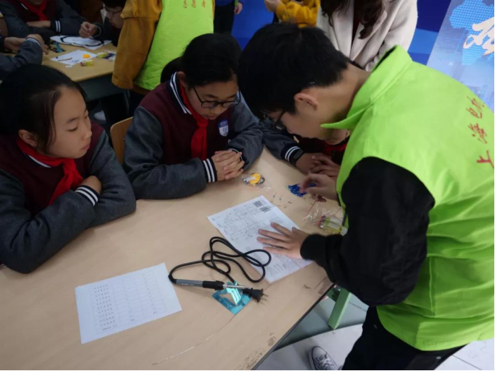 愉快学习的时间总是过得很快,不知不觉就到了最后一个环节:电焊无人小车和DIY制作小课堂。临外的学生们跃跃欲试,积极参与到动手操作中。在我校志愿者们的帮助下,大家合作把一个个零件组装、焊接成了一辆辆小车、会动的机器人、自动发球机等作品,看着临外学生们满足的笑容,志愿者们也很有成就感。