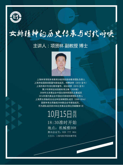 观影前夕,为帮助党员师生、入党积极分子了解中国女子排球运动发展历史、更全面深刻地理解女排精神,必赢国际437官网党总支特别邀请排球运动专家,上海体育学院体育教育训练学院排球教学团队负责人项贤林副教授做了题为“女排精神的历史传承与时代呼唤”的报告。项贤林博士是青少年排球运动技能标准主编、上海市校园排球联盟专家组成员、2008年北京奥运会中国女排科研团队主要成员、2016年里约奥运会中国坐式排球科研团队负责人、上海男女排备战全运会科技保障团队成员(2009-2016),国家体育总局备战2008奥运会专家组成员,作为团队成员,获2008北京奥运会突出贡献集体1次。