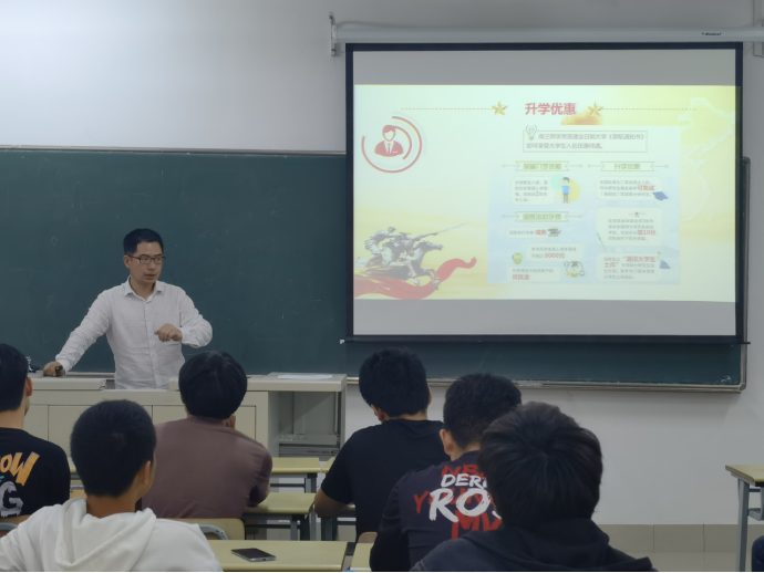 杨金平老师通过征兵概况、入伍流程、退役优抚、典型案例、常见问题答疑和参军入伍的意义等六个方面向同学们进行全面讲解,耐心地回答了同学们存在的疑问。