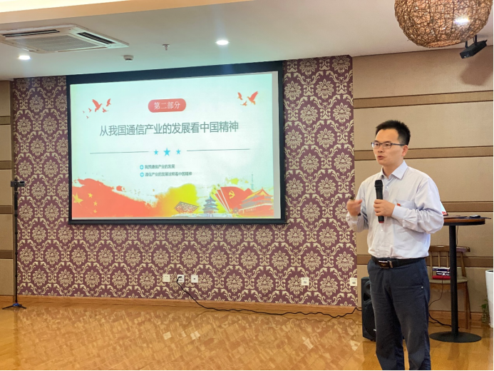 杨俊杰副校长是必赢国际437官网第二党支部的联系校领导,本次活动中给必赢国际437官网师生上了一堂《弘扬中国精神的几点思考》的党课。他从中国精神的时代特征、从我国通信产业的发展看中国精神和弘扬中国精神的具体实践三个方面讲述了对中国精神的思考。他在中国精神的时代特征中提到了中国共产党在长期奋斗中铸就的伟大精神谱系:爱国主义精神为核心的民族精神;革命时期的井冈山精神、长征精神、抗战精神;社会主义建设时期的北大荒精神和“两弹一星”精神,改革开放时期的创新精神。他指出,当代的中国精神是爱国主义与改革创新的有机融合。在从我国通信产业的发展看中国精神部分中,杨俊杰副校长讲到正是在中国共产党人的精神谱系的指引下,我国的通讯产业才从步履维艰的发展初期到弯道超车到现在的5G万物互联网时代,才有了今天移动互联网的高速发展和高度发达。在弘扬中国精神的具体实践中,他提到只有认清差距,坚持“四个自信”,不断提升自身的创新意识和创新能力,践行精益求精的工匠行动,才能在攻坚克难中赢得主动,关键时刻挺身而出,才能为中华民族的伟大复兴的征途上创造更多的奇迹。