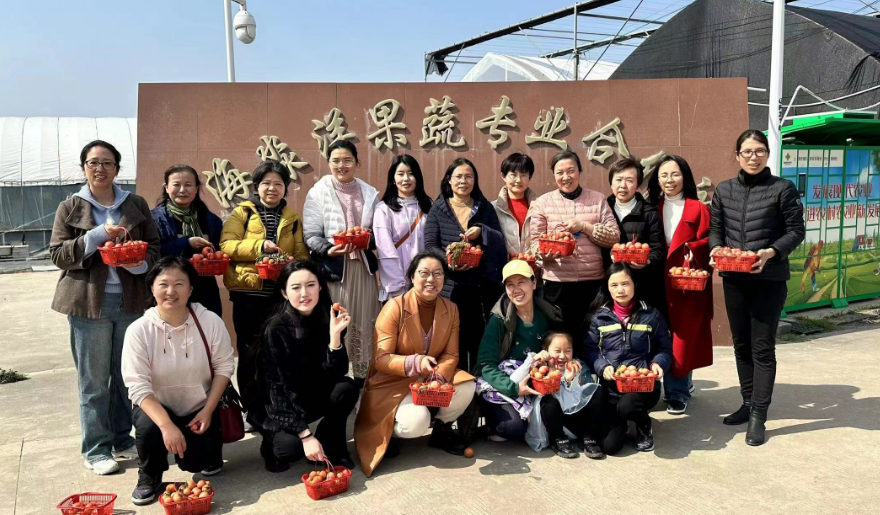 3月15日,部分女教工自驾来到浦东新区泥城镇的上海淼洋果蔬基地合作社进行采摘。基地大棚里种植了各种番茄、黄瓜、莴笋、牛心菜等农作物,女教工们体验了新鲜果蔬的采摘,收获满满。